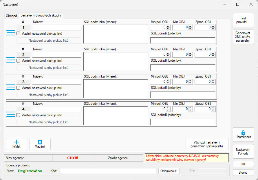 - nastaviť skupinu filtrov na výber objednávok, ktoré sa potom podľa týchto filtrov zoskupia do svozových skupín a rozdelia do pick-up listov