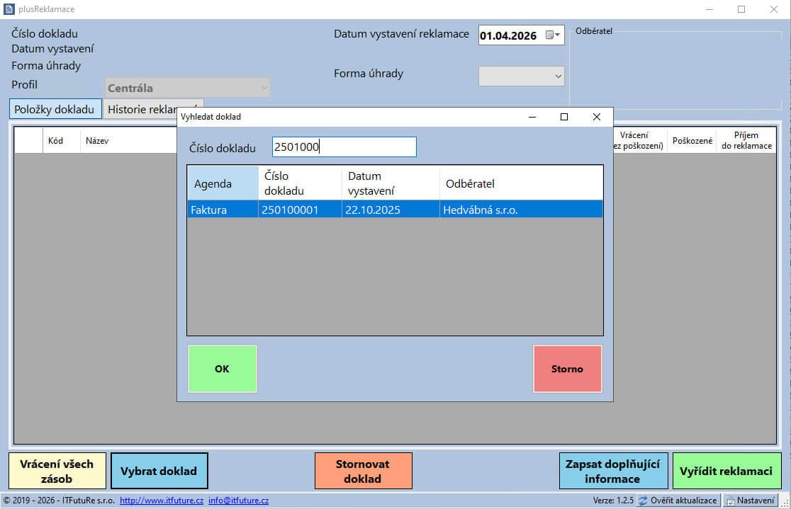 Aplikácia umožňuje riešenie reklamácie ako za celý vybraný doklad, tak aj len vybrané položky a ich čiastkové množstvo.